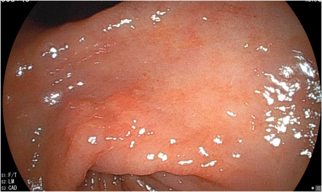 83歳女性の当院で行った上部内視鏡画像です。前庭部小弯側に周辺が隆起しており、中心が凹んだようにみえる病変を認めました。東邦大学へ紹介し早期胃がんと診断され内視鏡的切除予定です。